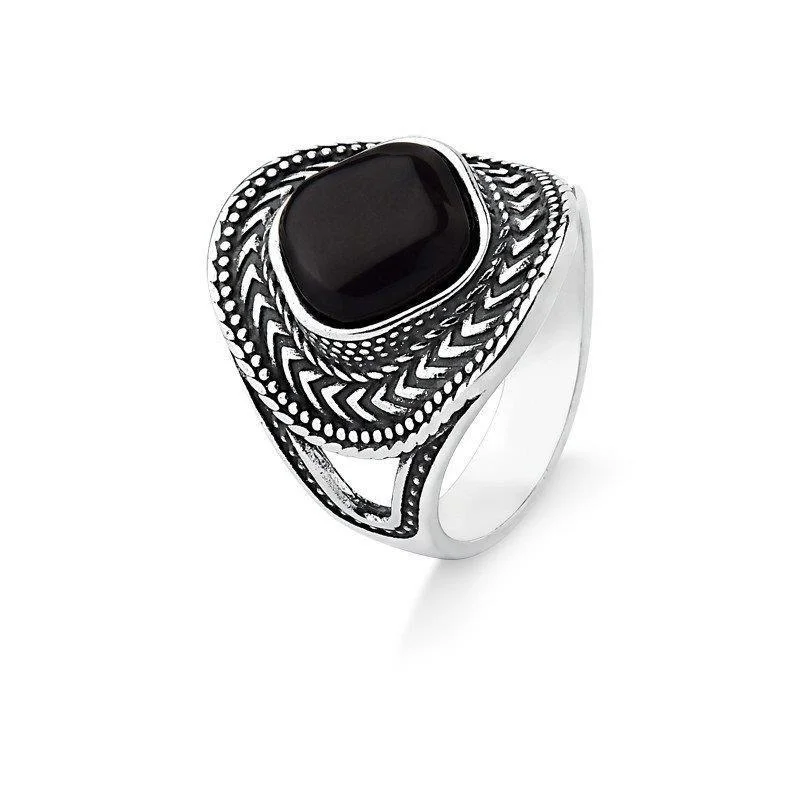 Anel Envelhecido Ágata NegraEste anel une a força da pedra ágata negra à textura marcante da prata envelhecida, criando uma peça de presença forte e cheia de personalidade. O contraste entre o brilho profundo da pedra e o acabamento escurecido da prata confere um visual sofisticado, ideal para quem valoriza autenticidade, elegância e joias com identidade própria.