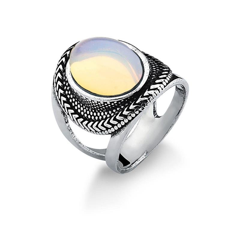Anel Envelhecido Opalina OvalEste anel combina o acabamento rústico da prata envelhecida com a suavidade e brilho natural da opalina em formato oval. A pedra, com seu tom sereno, transmite calma e delicadeza, enquanto o aro robusto em prata escurecida garante presença e estilo. Uma peça charmosa e atemporal, perfeita para quem busca autenticidade e elegância natural.