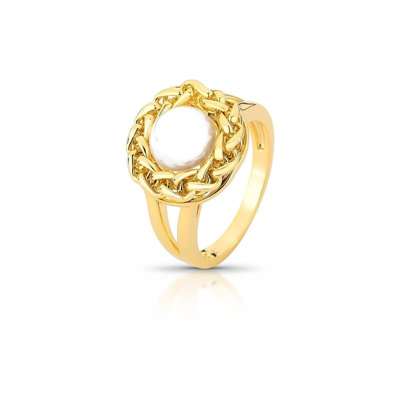 Anel Pérola EntrelaçadoCom design sofisticado e contemporâneo, este anel apresenta uma delicada pérola central envolvida por linhas douradas entrelaçadas que remetem à fluidez e harmonia. Uma joia versátil e elegante, perfeita para realçar tanto produções clássicas quanto modernas.