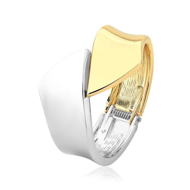 Bracelete Luxo Acessível Dual ChevronO Bracelete Dual Chevron apresenta um design angular e moderno, onde duas partes distintas em dourado e prateado se encontram, formando um 'V' estilizado ou um padrão chevron aberto. Uma peça que combina o brilho elegante dos dois metais com a força do design geométrico, perfeita para adicionar um toque arrojado e contemporâneo ao seu visual.