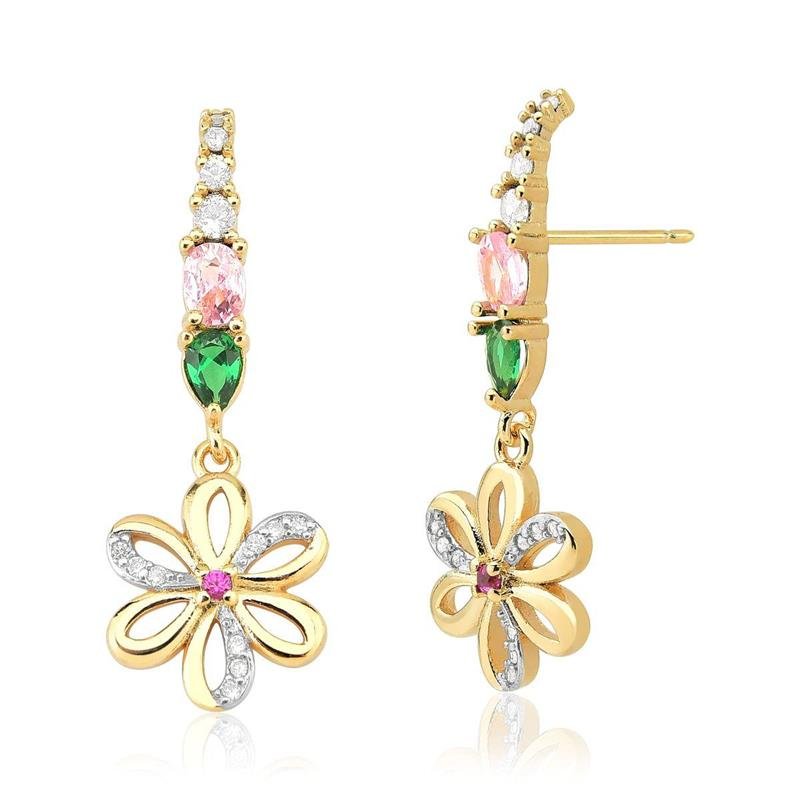 Brinco Flor Essence Zircônia ColorsÉ a joia perfeita para quem ama um acessório que une a delicadeza floral com a ousadia da cor. Seu design encantador combina uma flor cravejada com um pingente de zircônias coloridas, criando um contraste visual rico e atraente