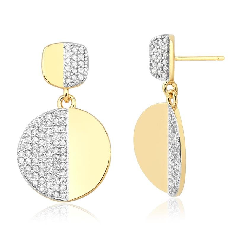 Brinco Round Estilizado e CravejadoEste brinco pendente apresenta um círculo levemente dobrado para frente, com metade cravejado de zircônias e a outra metade lisa. A peça é conectada a uma base quadrada, que fica na orelha, criando um design único e moderno. O contraste entre o brilho das zircônias e o acabamento liso, combinado com a base quadrada, traz sofisticação e estilo à peça.