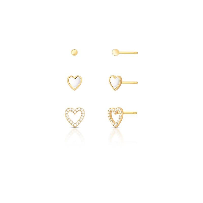 Brinco Trio Corações e BolinhaTrês pares de brincos delicados se unem em um conjunto versátil e encantador. Dois pares em formato de coração transmitem romantismo e feminilidade, enquanto o par de bolinha complementa com simplicidade e elegância. Uma combinação perfeita para diferentes estilos e momentos, que pode ser usada junta ou separadamente, sempre com leveza e charme..