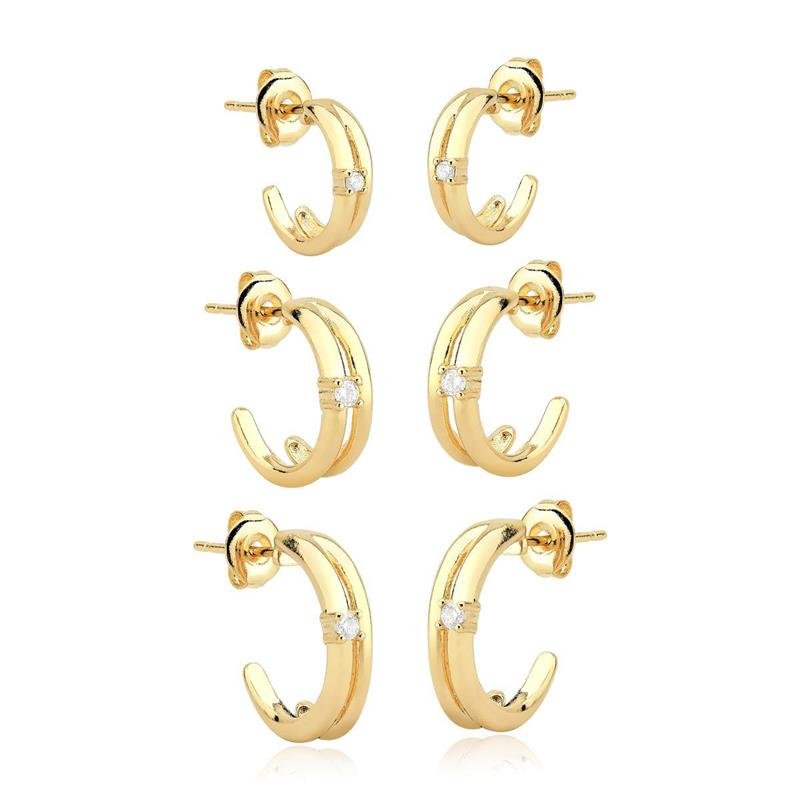 Brinco Trio Meia Argola Duas LinhasO Brinco Trio Meia Argola Duas Linhas é um conjunto sofisticado que une design moderno e delicadeza. Cada meia argola apresenta duas linhas paralelas que criam um visual leve e elegante, perfeito para combinações versáteis. Pode ser usado junto ou separadamente, trazendo charme em diferentes estilos. Uma joia atemporal que traduz feminilidade e sofisticação em cada detalhe.