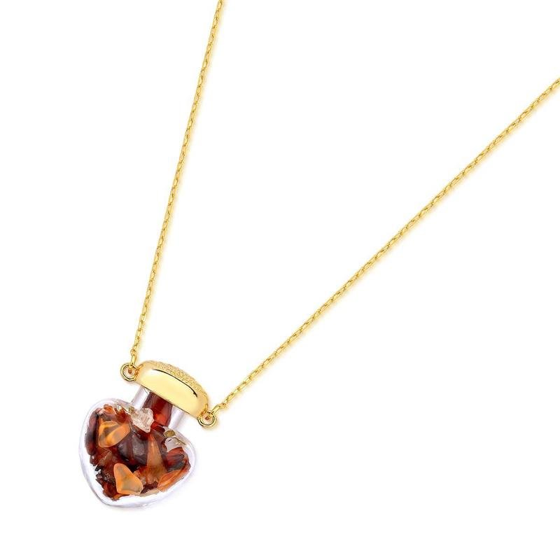 Colar Ágata Vermelha Pingente de VidroEste colar traz um encantador pingente em formato de coração feito em VIDRO, com pequenos fragmentos de Ágata Vermelha soltos em seu interior, criando um efeito visual sutil e mágico a cada movimento. A transparência do vidro somada ao brilho das pedras proporciona leveza e romantismo à peça, perfeita para composições delicadas e cheias de significado.