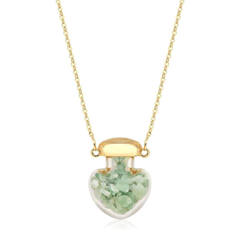 Este colar traz um encantador pingente em formato de coração feito em VIDRO, com pequenos fragmentos de Quartzo Verde soltos em seu interior, criando um efeito visual sutil e mágico a cada movimento. A transparência do vidro somada ao brilho das pedras proporciona leveza e romantismo à peça, perfeita para composições delicadas e cheias de significado.Por serem naturais, as pedras podem apresentar variações de cor e formato, tornando cada peça única.