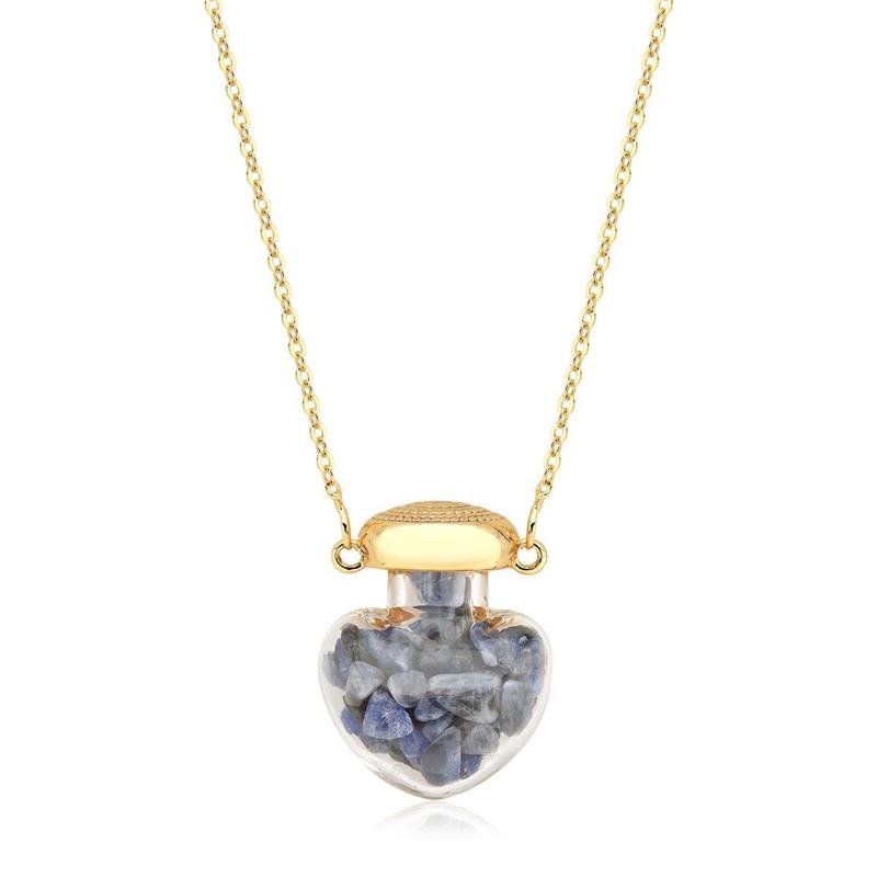Colar Sodalita Pingente de VidroEste colar traz um encantador pingente em formato de coração feito em VIDRO, com pequenos fragmentos de Sodalita soltos em seu interior, criando um efeito visual sutil e mágico a cada movimento. A transparência do vidro somada ao brilho das pedras proporciona leveza e romantismo à peça, perfeita para composições delicadas e cheias de significado.