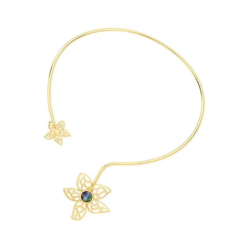 Colar Arco Flor AbaloneColar com design delicado, composto por duas flores nas extremidades. A flor maior, com o centro em abalone, exibe tonalidades iridescentes, enquanto a flor menor, em dourado, complementa o conjunto com um toque de elegância. Uma peça única que combina sofisticação e leveza.