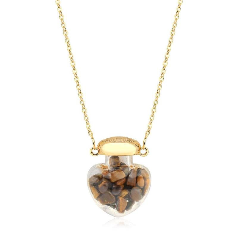 Colar Olho de Tigre Pingente de VidroEste colar traz um encantador pingente em formato de coração feito em vidro, com pequenos fragmentos de olho de tigre soltos em seu interior, criando um efeito visual sutil e mágico a cada movimento. A transparência do vidro somada ao brilho das pedras proporciona leveza e romantismo à peça, perfeita para composições delicadas e cheias de significado.