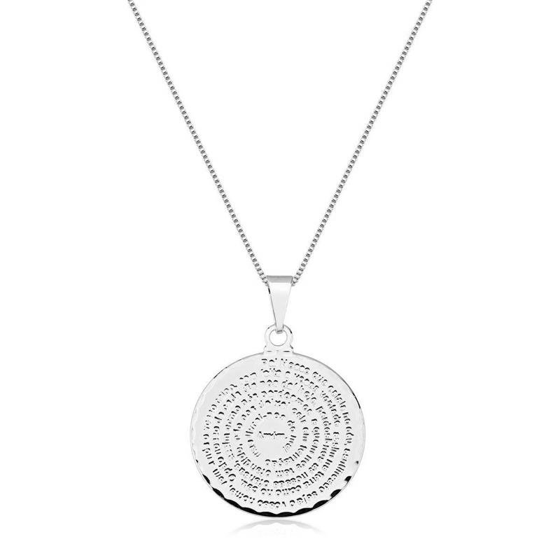 Colar Prata Leve Medalha Pai Nosso 2.5cmEste colar em prata leve traz uma medalha delicada de 2,5 cm com a inscrição do Pai Nosso, uma peça cheia de significado e espiritualidade. Seu design simples e elegante é perfeito para quem busca um acessório que combine com o cotidiano, transmitindo fé e serenidade. O banho de prata confere brilho e sofisticação, tornando esta peça ideal para ocasiões que exigem um toque de delicadeza e devoção.