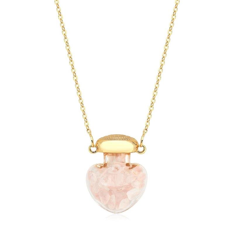 Colar Quartzo Rosa Pingente de VidroEste colar traz um encantador pingente em formato de coração feito em vidro, com pequenos fragmentos de Quartzo Rosa soltos em seu interior, criando um efeito visual sutil e mágico a cada movimento. A transparência do vidro somada ao brilho das pedras proporciona leveza e romantismo à peça, perfeita para composições delicadas e cheias de significado.