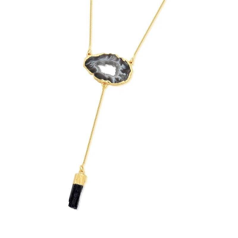 Colar com duas pedras, uma pedra bruta de turmalina negra e a outra pedra natural de geodo, extraida do interior de uma ágata, possuindo detalhes em drusa, com formato e tamanhos variados.