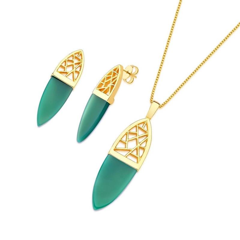 Conjunto Ágata Verde LançaElegante e imponente, este conjunto é composto por colar e brincos com pedras naturais de ágata verde em formato de lança, que transmitem força e sofisticação. O tom profundo da pedra se destaca no design moderno, perfeito para quem busca uma peça marcante e cheia de personalidade.