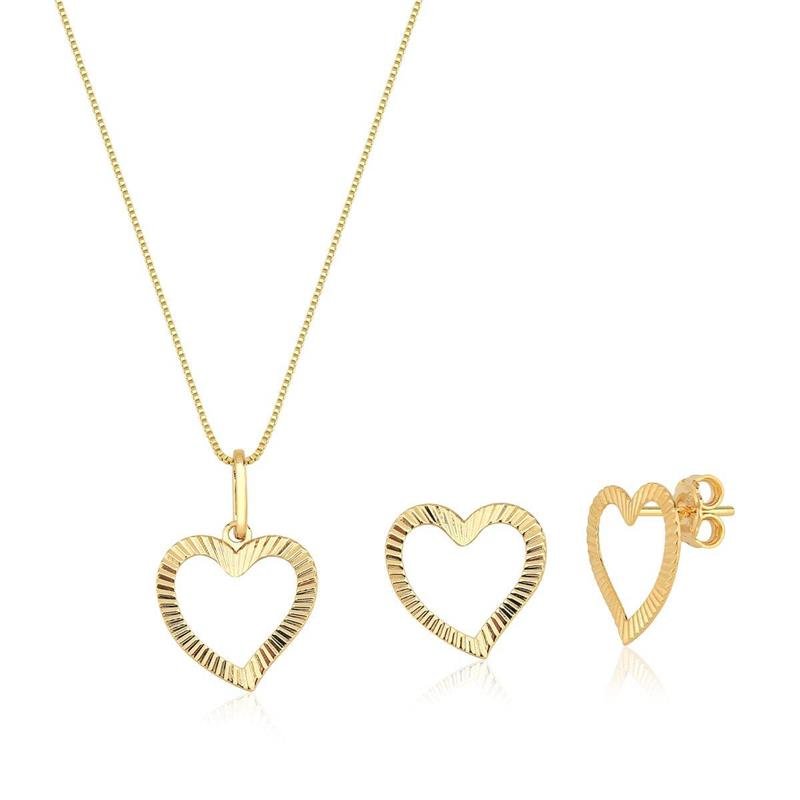 Conjunto Coração DiamantadoConjunto Coração Diamantado com colar e brincos que apresentam o clássico formato de coração em acabamento diamantado, que reflete a luz com delicadeza e sofisticação. Uma peça romântica e versátil, ideal para compor looks elegantes com um toque de brilho sutil.
