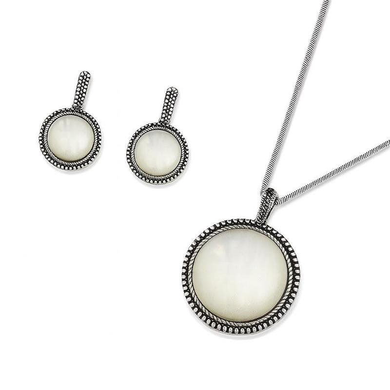 Conjunto Envelhecido Madrepérola RedondoEste conjunto apresenta um design redondo em prata envelhecida, com detalhe central em madrepérola que adiciona luminosidade e charme atemporal. A harmonia entre o acabamento rústico da prata e a delicadeza da madrepérola cria uma peça única, ideal para quem busca elegância com personalidade. Perfeito para produções marcantes e versáteis.