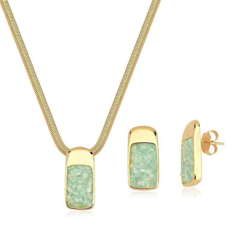 Moderno e elegante, este conjunto é composto por colar e brincos com fragmentos naturais de amazonita verde em formato retangular. A pedra, com seu tom suave e refrescante, é associada à harmonia e tranquilidade, enquanto o corte geométrico realça sua textura orgânica. Uma combinação perfeita de design contemporâneo e beleza natural para compor looks sofisticados e cheios de personalidade