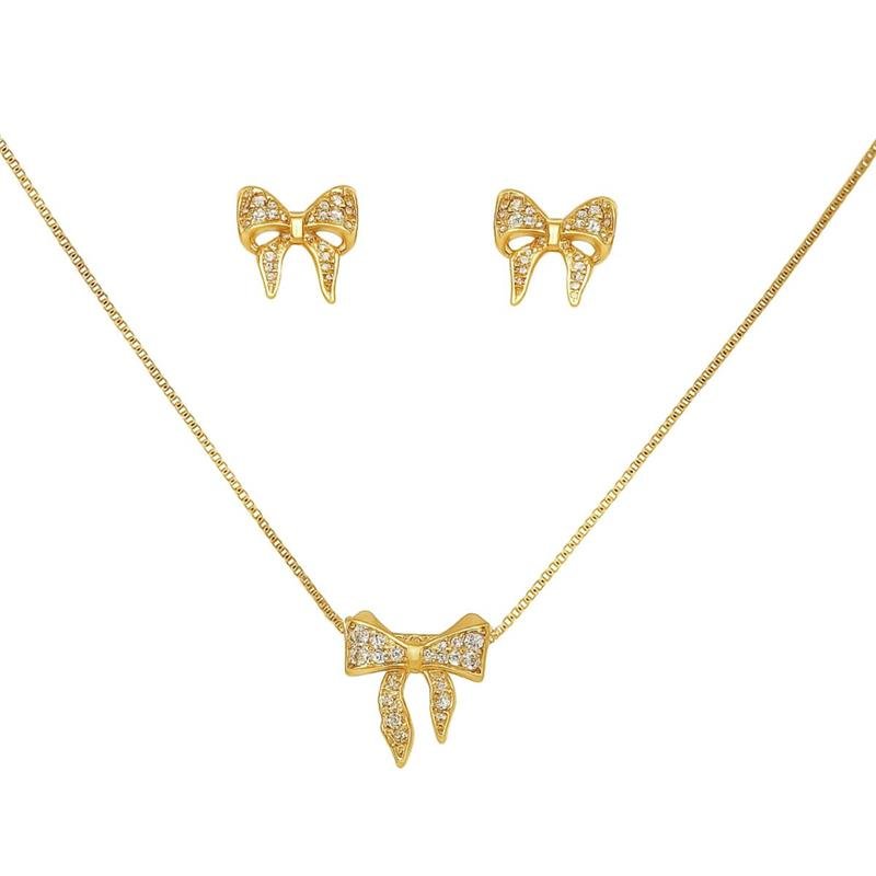 Conjunto Laço CravejadoDelicadeza e brilho em perfeita harmonia. O laço, símbolo de feminilidade e charme, ganha destaque com o toque sofisticado das zircônias cravejadas, trazendo elegância e romantismo para qualquer ocasião.