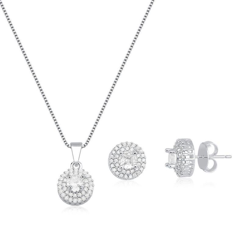 Conjunto Prata Leve Redondo Cravejado PO Conjunto Prata Leve Redondo Cravejado é uma joia clássica e luminosa, perfeita para quem busca brilho com leveza. O colar e os brincos apresentam design redondo cravejado com zircônias que refletem a luz de forma delicada e refinada. Seu acabamento prateado adiciona um toque moderno e versátil. Uma peça feminina e atemporal que traduz elegância, charme e sofisticação em cada detalhe.