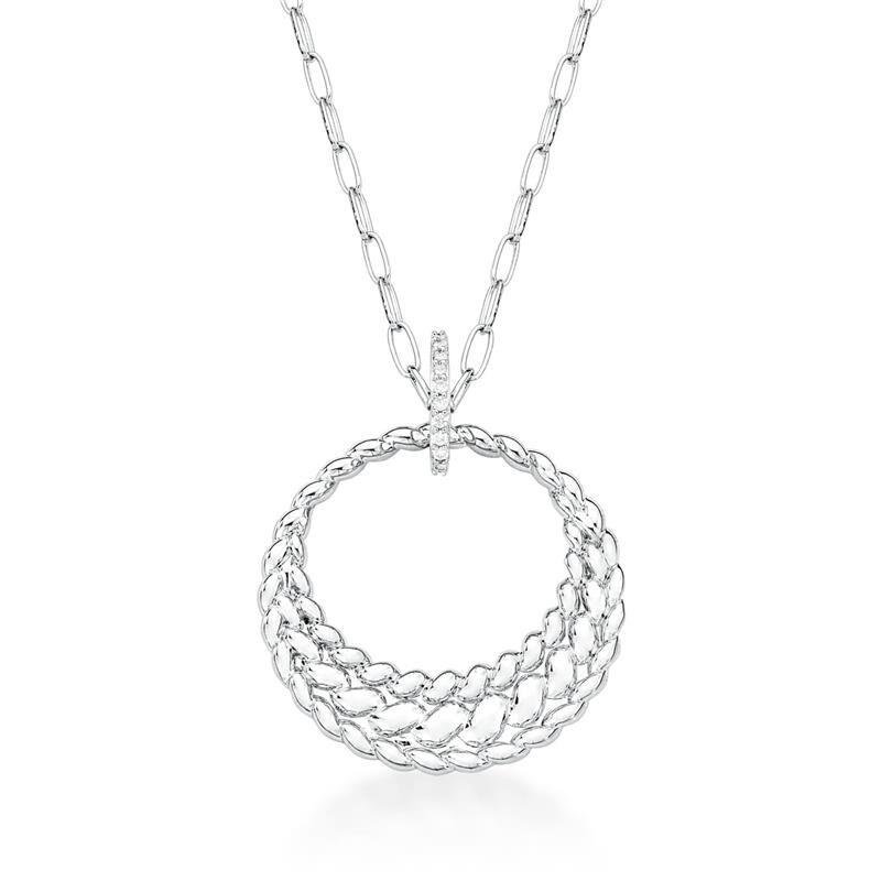 Nesta coleção, apresentamos essa corrente com pingente banhado a ródio, em malha com elos retangulares, pingente redondo trabalhado e liso, com fecho cravejado de zircônias brancas. Essa peça remete modernidade e sofisticação, proporcionando um look cheio de charme e elegância.