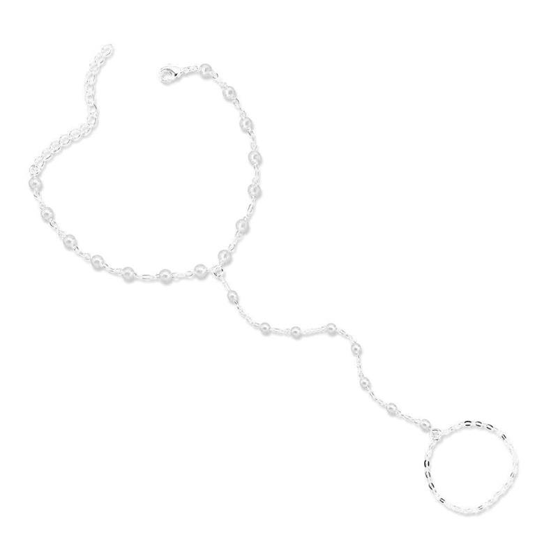 Pulseira de Mão Prata Leve PérolasClássica e delicada, esta pulseira de mão é formada por pequenas pérolas que criam um visual sofisticado e atemporal. Uma peça charmosa e versátil, perfeita para destacar as mãos com elegância em ocasiões especiais ou no dia a dia.
